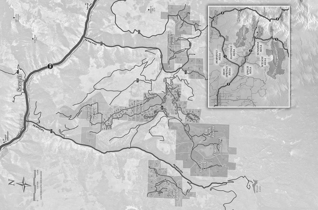 Iron Springs/Horsefly Mesa - 25+ miles to Telluride Anderson Ranch, Big Valley Ranch, The Bluffs, Brown Ranch, Canyon Creek Ranch, Colt Meadows Ranch, Cornerstone, Dancing Bear Ranch, Eagle Ridge Ranch, Elks Summit, Frontier, Golden Bear Ranch, Gracie Sky Mountain Ranch, Lakes at Carstens Ranch, McKenzie Spring Ranch, Panorama Acres, Rosorado, and San Juan Ranch