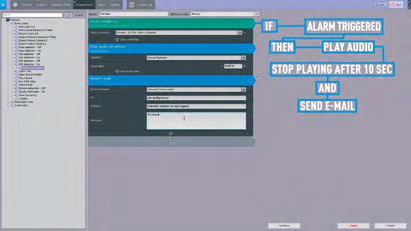 Axxon Next es compatible con una configuración flexible de respuestas complejas del sistema a cualquier grupo de eventos especificado. Utilice la lógica de IF...THEN (SI...ENTONCES) para crear un macro que realice automáticamente un número ilimitado de acciones en el sistema. Los macros permiten programar reacciones a eventos particulares a nivel de sistema y de dispositivo.
