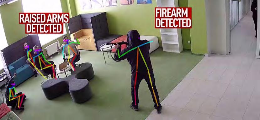 El análisis de comportamiento reconoce situaciones peligrosas al detectar posturas humanas específicas. Por ejemplo: los brazos alzados de un cajero o una persona agachada cerca de un cajero automático. Con base en el análisis de comportamiento, el detector de tirador activo detecta a un pistolero en potencia en tiempo real. Las alertas rápidas a las primeras respuestas minimizan el riesgo para los individuos, grupos e instalaciones.