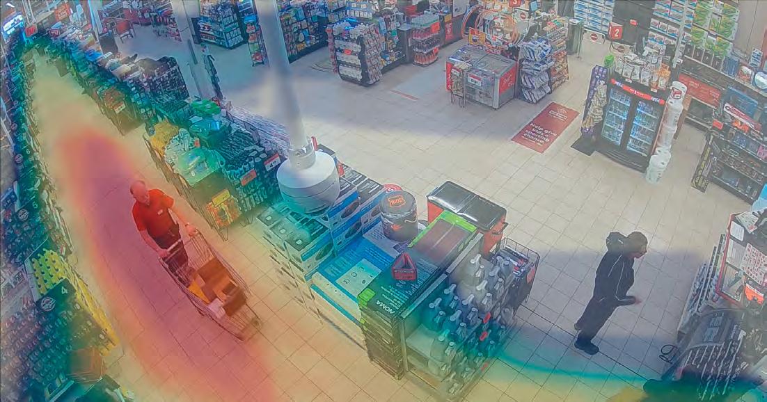 El mapa de calor es una representación gráfica de la actividad de los visitantes (número de visitantes/tiempo ocupado) en diferentes áreas de la tienda. El mapa de calor puede generarse ya sea con los datos de seguimiento de todos los objetos o de objetos especificados con los criterios de búsqueda forense.