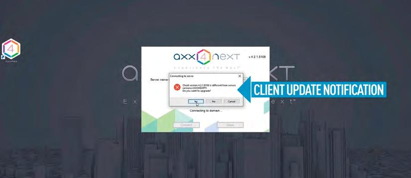 Cuando su cliente de Axxon Next se conecta al servidor con una versión más nueva de Axxon Next VMS, se le pedirá que actualice el software de su cliente. Después de la confirmación, el proceso de actualización se realiza en automático.