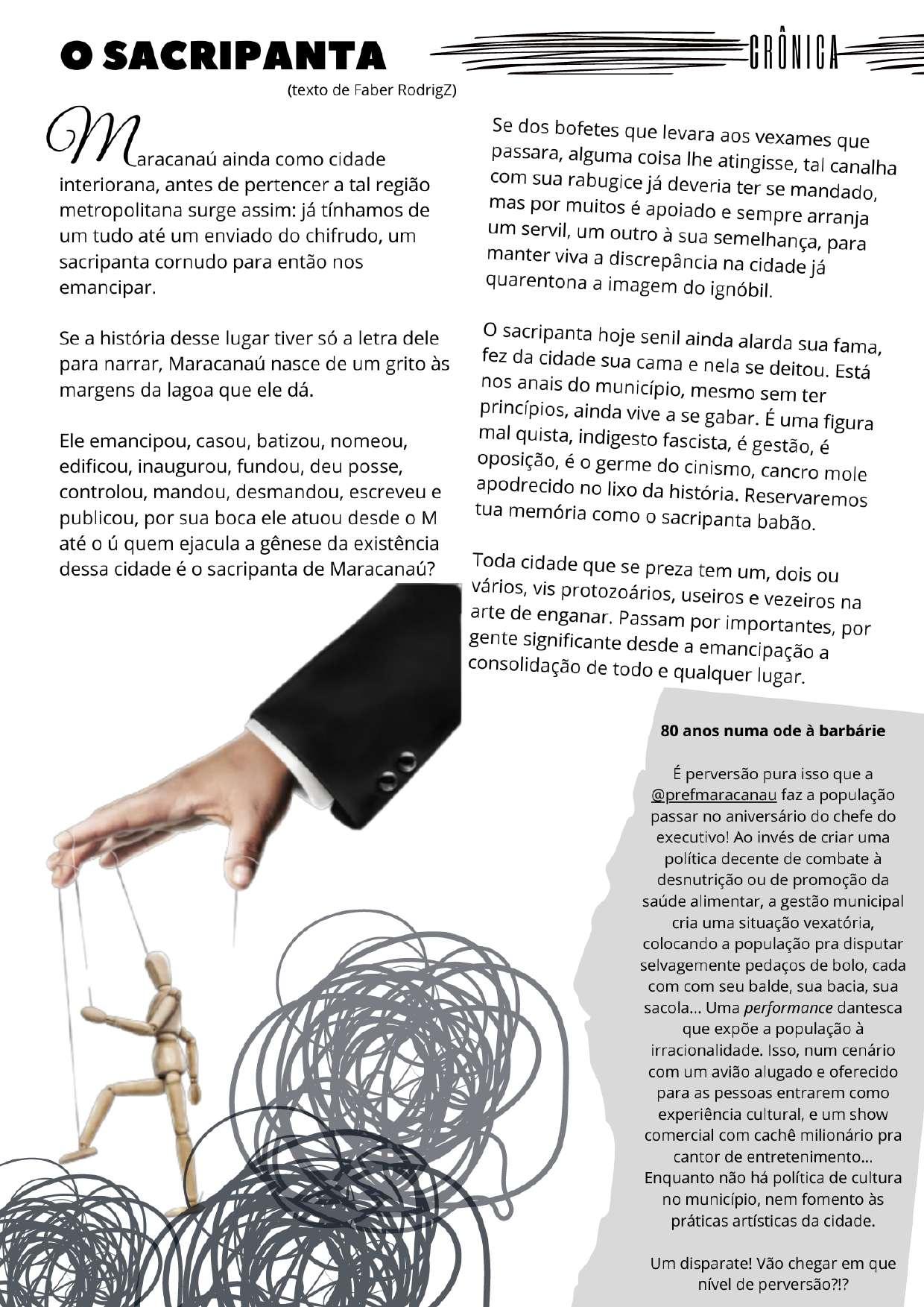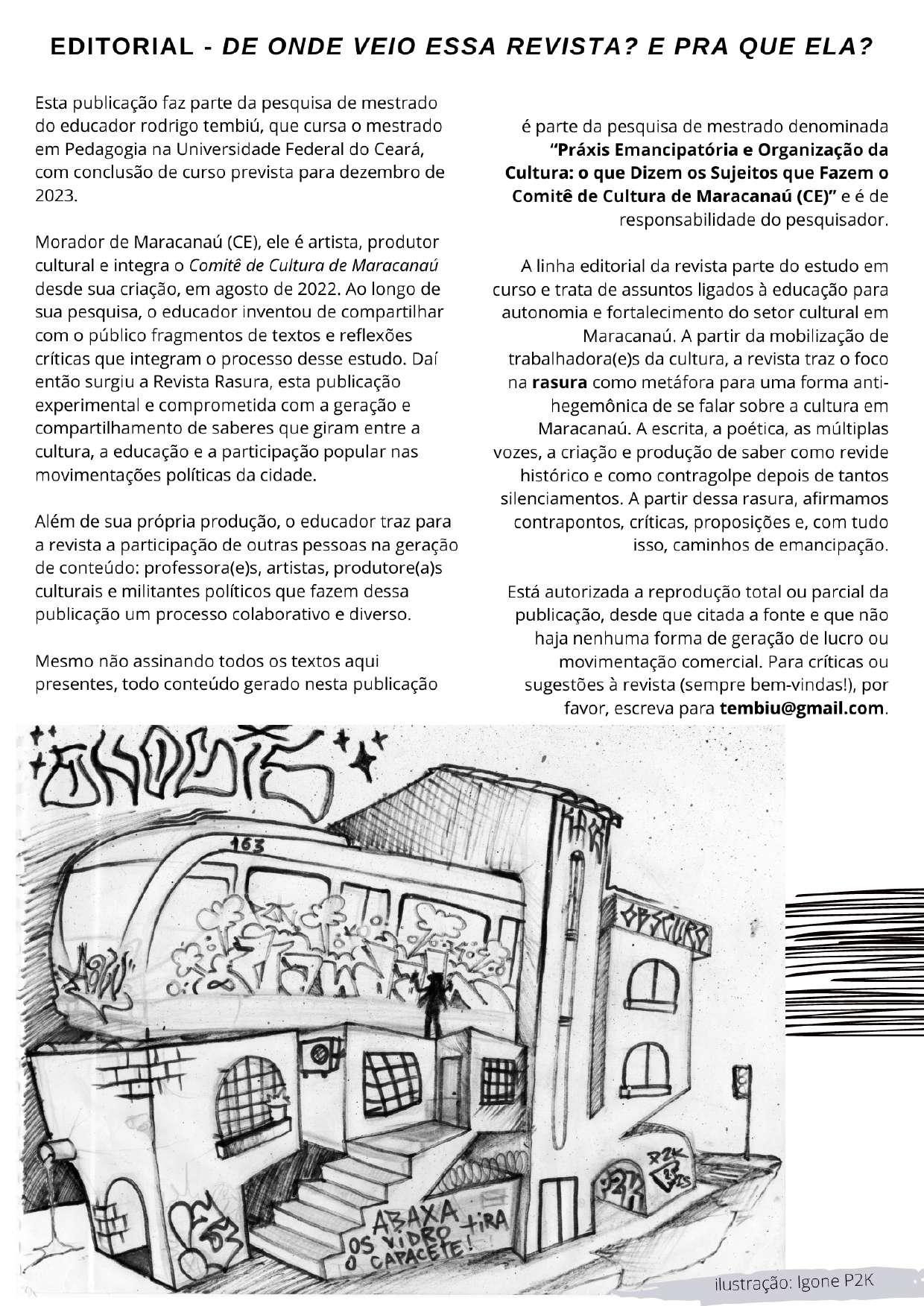 Morador de Maracanaú (CE), ele é artista, produtor cultural e integra o Comitê de Cultura de Maracanaú desde sua criação, em agosto de 2022. Ao longo de sua pesquisa, o educador inventou de compartilhar com o público fragmentos de textos e reflexões críticas que integram o processo desse estudo. Daí então surgiu a Revista Rasura, esta publicação experimental e comprometida com a geração e compartilhamento de saberes que giram entre a cultura, a educação e a participação popular nas movimentações políticas da cidade.