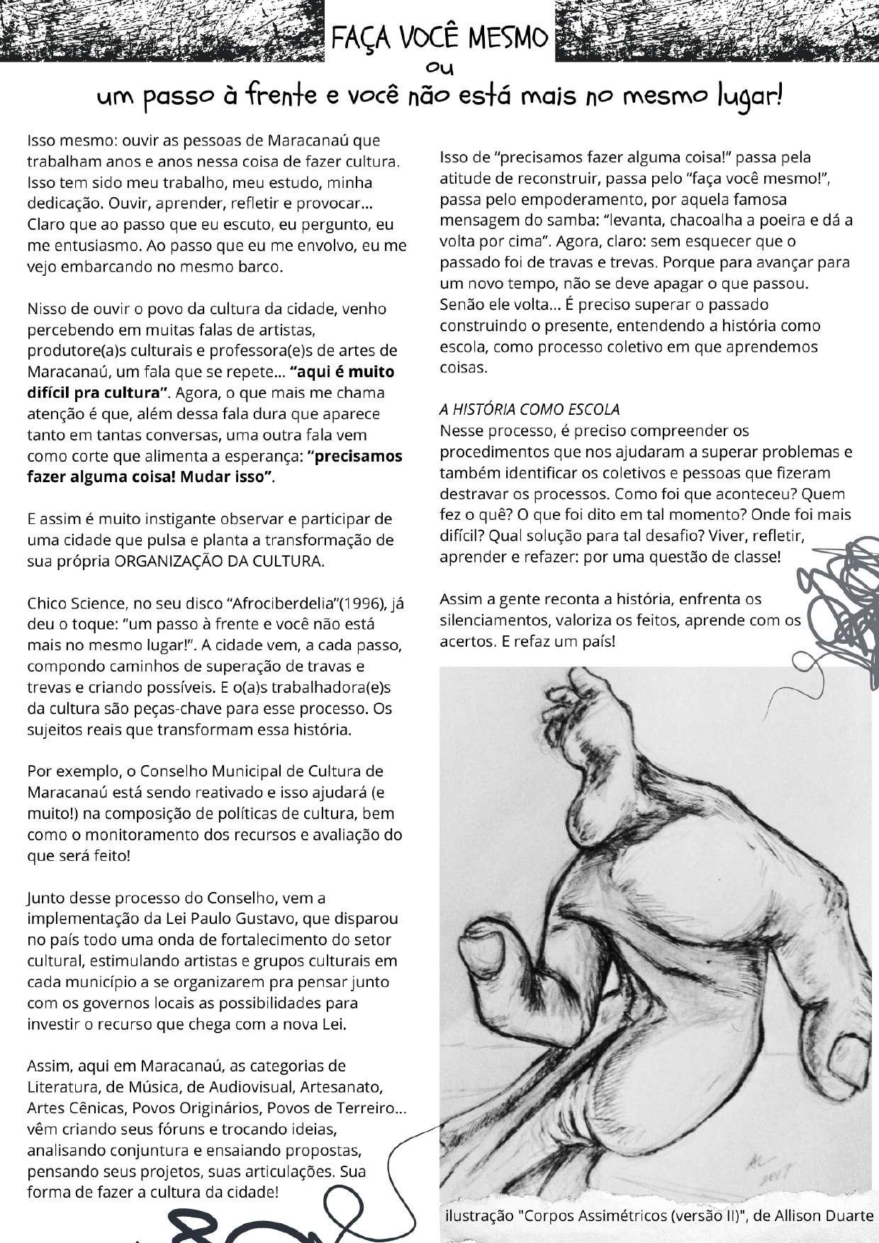 Além de sua própria produção, o educador traz para a revista a participação de outras pessoas na geração de conteúdo: professora(e)s, artistas, produtore(a)s culturais e militantes políticos que fazem dessa publicação um processo colaborativo e diverso.
