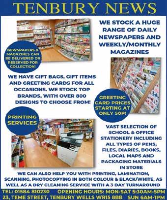 2023 SATURDAY OCT 7TH, 2023 NOTE THE DATE 07973 549921 or chair.tapplefest@gmail.com EST 12 Years AIRPORT TRANSFERS ALL UK AIRPORTS/PORTS + Local Professional, Reliable, Local Cars/Drivers Virtual Rank 01584 819957 www.bizzycars.co.uk Your local insurance experts www.caleb-roberts.co.uk 0330 175 8779 MIKE’S SANDWICH BAR 6 TEME STREET 01584 812521 Breakfast Bacon / Sausage Baps Lunch Hot or Cold Sandwiches Bar, Baked Potatoes, Tea & Coffee Commercial, Office and Industrial pre-ordered deliveries available FROM 11am DAILY Our Famous - Free Range HOT PORK BAPS SANDWICHES – BAGUETTES stuffing, apple sauce, crackling, gravy OPEN DAILY 8AM HOME HEATING OIL 01588 660166 Deakins Fuels Professional, reliable and affordable pet care OUR SERVICES Dog walking - Pet sitting Home-boarding - Small pet care - LivestockEquines - 1-1 and group dog training classes Our team are fully insured and DBS checked for complete peace of mind. Email: itsnotadogkennelteam@gmail.com Tel: 01584 781159 / 07709 400228 Website: www.itsnotadogkennel.com 01584 811285 One size Italian clothing, hosiery, bags & much more 44 Teme St, Tenbury Wells, WR15 8AA