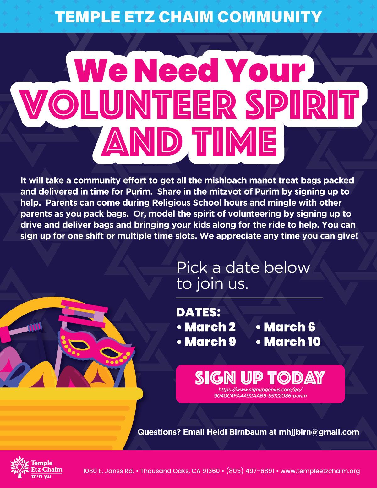 A great big THANK YOU to the many sponsors of our Mishloach Manot FUN-raiser as well as the countless volunteers that will be assembling and distributing the gift bags. It truly takes a village. Every family in our TEC community will receive a gift of sweets in celebration of Purim. These gifts will be distributed as follows: