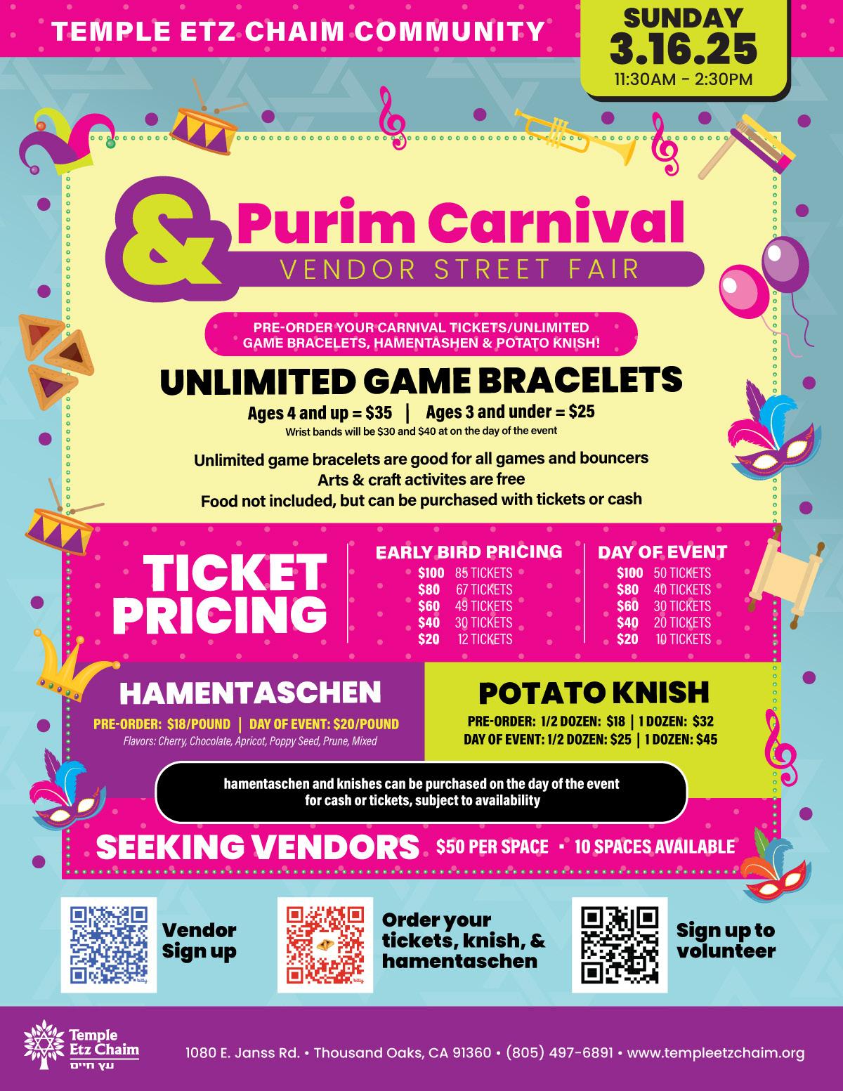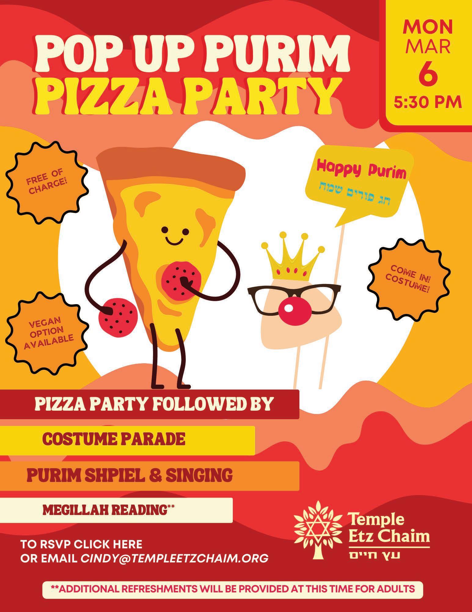 by dressing up in Purim costumes, singing holiday songs with Cantor Kenny and Rabbi Ari and enjoying a pizza lunch sponsored by our Parents of Temple Etz Chaim (PTEC). The preschool children will also enjoy a Purim puppet show and bake hamantaschen.