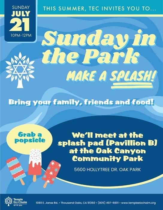 July SUN MON TUE WED THU FRI SAT 1 2 3 4 5 6 7 8 9 10 11 12 Shabbat Under the Stars 13 14 ECE Back-toSchool Event 15 16 Feed the Hungry Book Club 17 18 19 Tot Shabbat (Dress Hawaiian) 20 Eli Ben-Tov Bar Mitzvah 21 Sunday in the Park: Oak Canyon Community Park Splash Pad 22 23 24 Board Meeting 25 26 Infant Center Picnic 27 28 Sound of Music at Fred Kavali Theater 29 30 31 www.templeetzchaim.org June - July 2024 | Iyar-Tammuz 5784 21