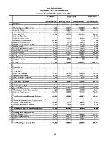 Temple Shalom of Naples Proposed 2017/2018 Consolidated Budget As Approved by the Board of Trustees, March 8, 2017 FY 2015/2016