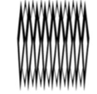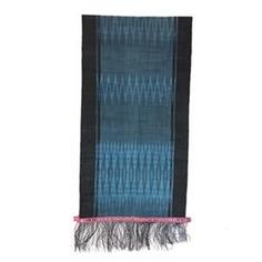 Garis-garis biru berisi panah ikat putih, semuanya mengarah ke arah yang sama, disusun dalam barisan sempit di sepanjang pakan dengan baris yang lebih lebar di setiap ujungnya. Pada ujungnya terdapat area luas pola pendamping yang sering terlihat pada banyak jenis ulos Batak Toba berkualitas tinggi.