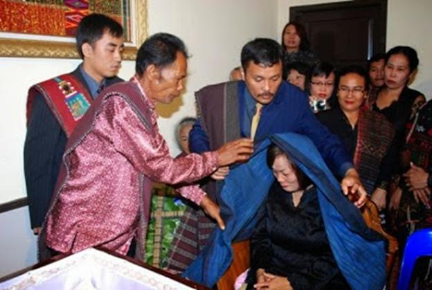 Selain sebagai lambang berkat, doa doa baik, ulos juga biasa digunakan dalam upacara pemakaman oleh masyarakat batak Penggunaan kain dalam upacara adat pun berbeda beda jenisnya ataupun motifnya Dalam upacara pemakaman jenik ulos yang biasa digunakan adalah ulos tujung dan ulos saput.