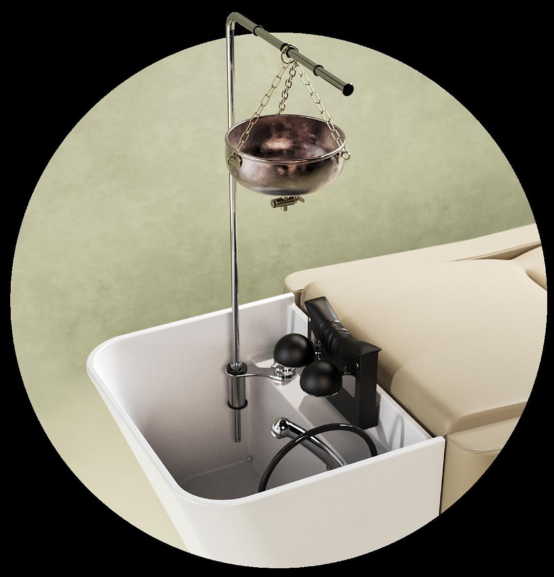 The system integrated into the basin allows three holistic treatments designed for physical well-being, as well as the beauty of hair and skin. The Flower Water, Snehana and Shirodhara, This immersive ritual harmonizes body and mind, hydrating the hair with essential oils for a profound sense of calm and relaxation.