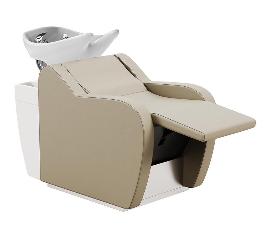 Backwash with electrical legrest and Shiatsu air massage. White basin H1, drop-stop system