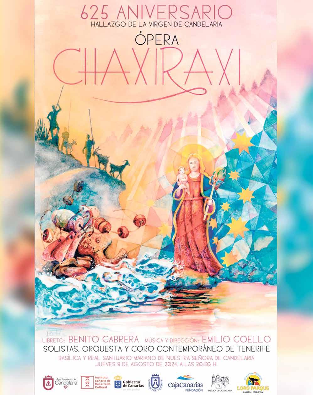Una vez acabada la intervención del pregonero, le llegó al turno a otro de los actos más esperados de las fiestas el estreno mundial de la ópera Chaxiraxi, con libreto de Benito Cabrera y música de Emilio Coello. Obra que narra el hallazgo de la talla de la Virgen por parte de los guanches y lo que aconteció años después. Es una historia de asombros y desencuentros, que culmina con el proceso de asimilación de la nueva forma de concebir el mundo religioso y social de los isleños.