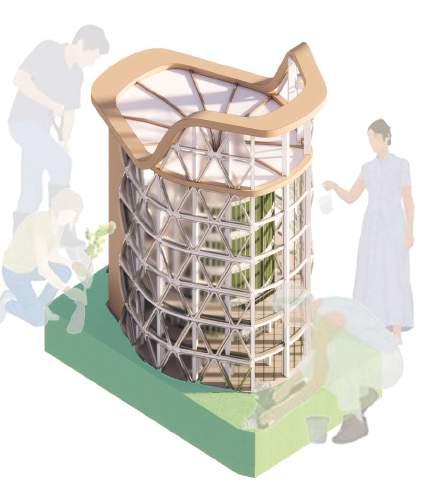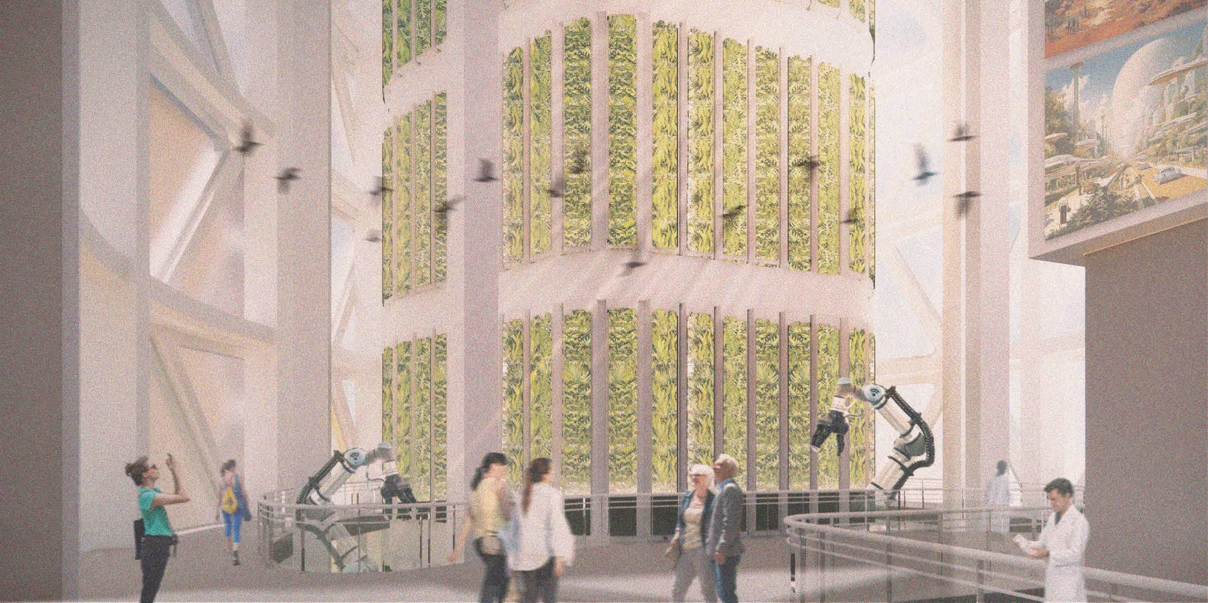 Perspective view that shows the interaction of visitors and researchers around the cultivation tower