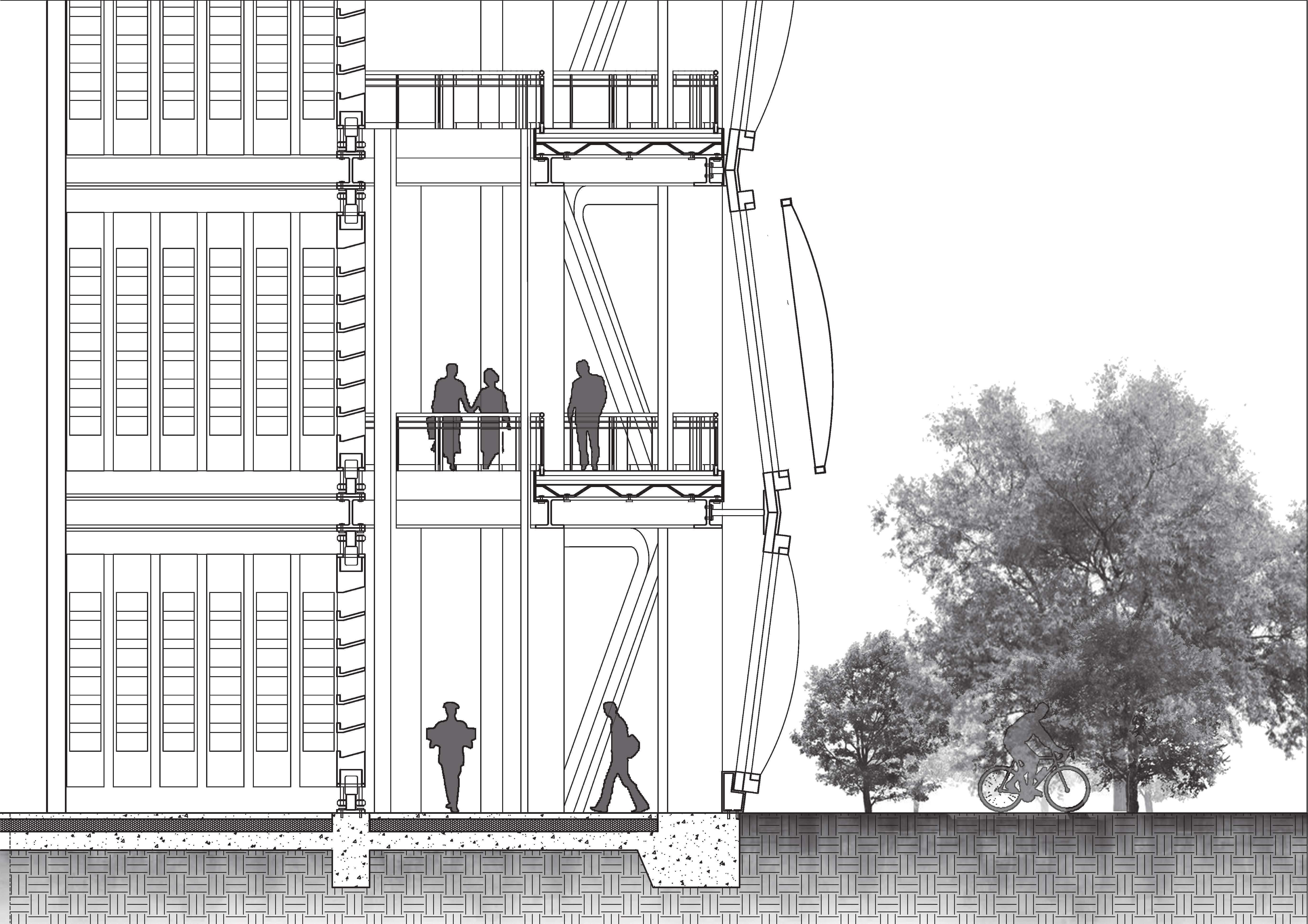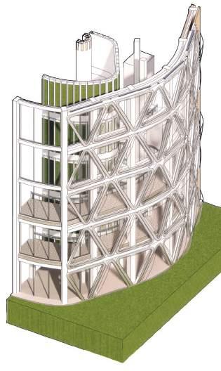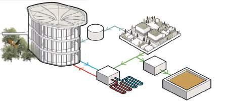 During summer, the steel frame facade will be covered with microalgae at its highest. Through the reaction of photosynthesis, algae, water, nutrients and carbon dioxided, will result in the production of biofuel. This may generate the necessary energy for the building.