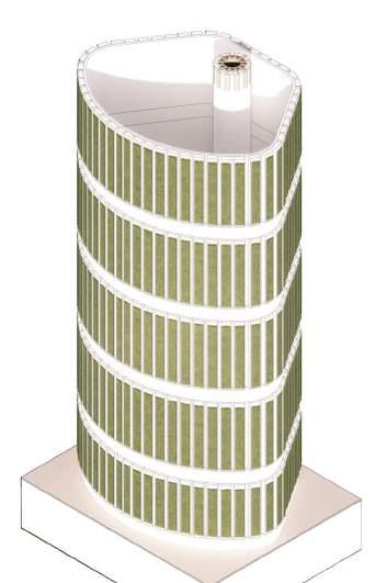 Our vertical farming tower’s basic shape is cylindrical, as it enhances aerodynamic efficiency and guarantees a consistent distribution of sunlight, a feature that has proven successful in similar structures. Our design strategically aligns with the sun’s path to ensure that there is a consistent amount of sunlight exposure throughout the year, which maximises farming productivity of the genetic modified crops and operational efficiency.