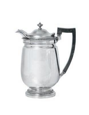 A George III Silver Hot-Water Jug, by Charles Wright, London, 1779 vase-shaped and with beaded borders, on square base with four ball feet, the hinged cover with beaded vase finial, with wood handle, engraved with a coat-of-arms