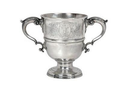 A George III Irish Silver Two-Handled Cup, Maker’s Mark RW Only, Perhaps for Richard Williams, Dublin, Circa 1760 inverted bell-shaped and on spreading foot, with two leaf-capped scroll handles and central reeded band, engraved on one side with a coat-ofarms and on the other with a crest, each within differing foliage 16.2cm high, 27oz, 840g