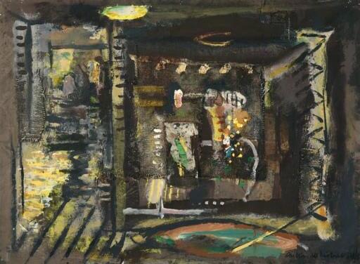 With the encouragement of his family and his collier y training officer, who spotted him drawing on the side of coal tubs, he enrolled in Darlington School of Ar t in 1944, but all the while continued to educate himself by studying human anatomy and visiting galleries and exhibitions in his own time. In 1948, however, he joined the Spennymoor Settlement – a miners’ education and recreation organisation – and came into the circle of writer Sid Chaplin, ar tist Norman Cornish and Bill Farrell, the Settlement’s director Farrell was an exponent of experiential ar t, and encouraged McGuinness to paint what he knew, which was mining.