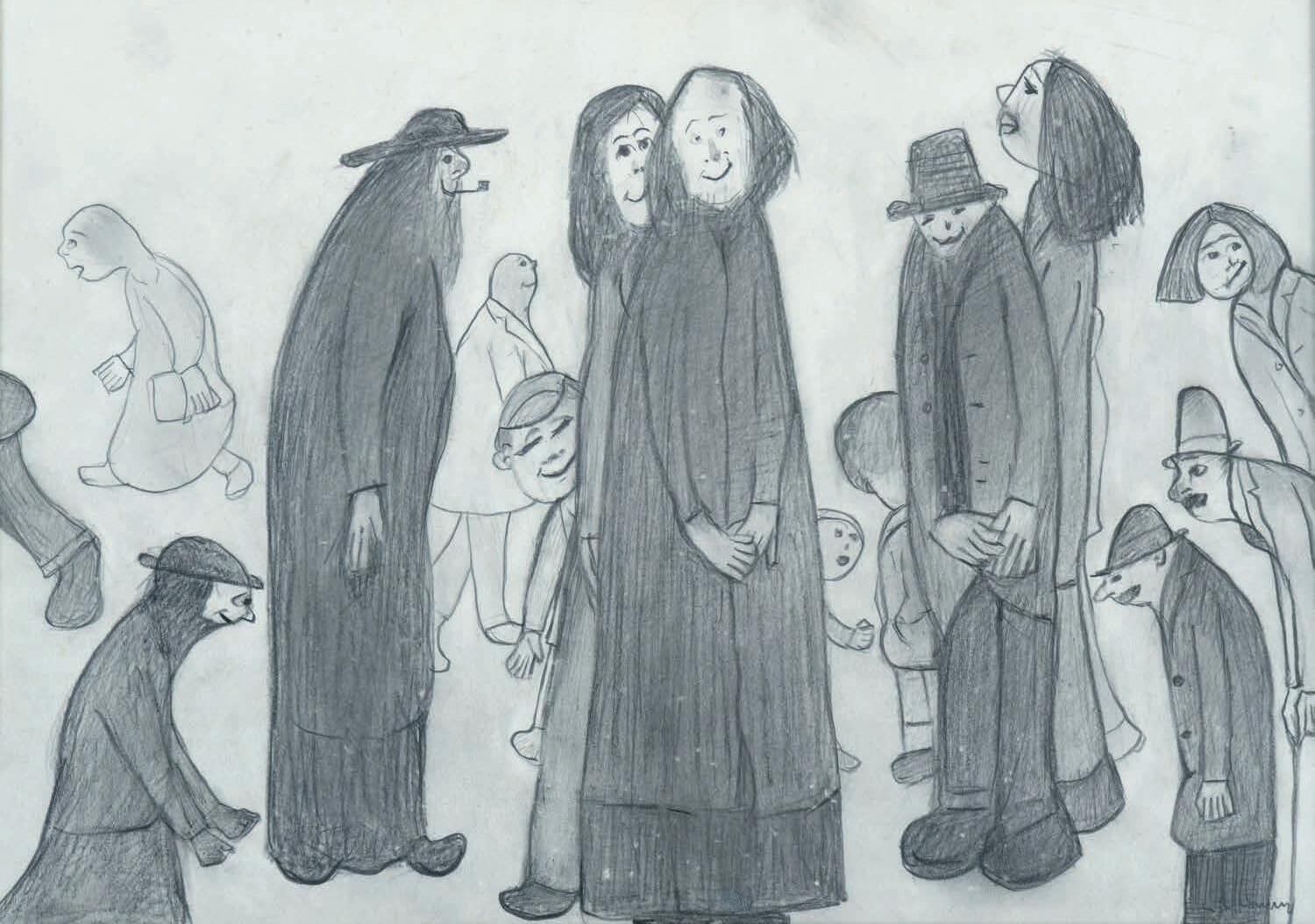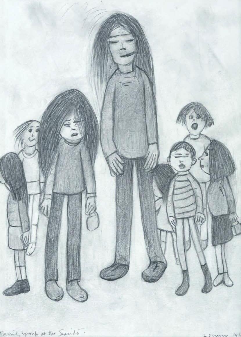 From the 1960s, towards the later stages of his life, Lowr y’s drawings became both less formal and more critical towards his subjects. Figures became almost objects of ridicule, in exaggeratedly ill-fitting clothes, shoes and hats, as seen in ‘Group of Figures Young and Old’ (lot 27). He often focussed, too, on marginalised or unsavour y figures such as tramps and football hooligans, leaning more towards a social commentar y rather than purely documenting his surroundings. “Family Group at the Seaside” (1969) (lot 26), is a rare example of Lowr y’s depictions of contemporar y dress and hairstyles. The drawing, which comes with provenance from the Lefevre Galler y in London, Lowr y’s dealer ’ and is illustrated in Mer vyn Levy’s 1976 book “The Drawings of L S Lowry, Public and Private”
