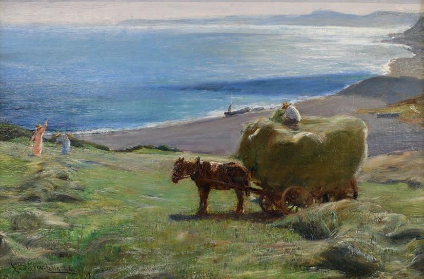 Arthur A Friedenson (1872-1955) Loaded hay wagon and haymaking before a sun drenched coast Signed and dated (18)94? oil on canvas, 28.5cm by 44cm £1,000-1,500