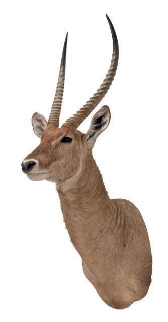 Taxidermy: Common Waterbuck (Kobus ellipsiprymnus), circa late 20th century, South Africa, an adult male shoulder mount looking straight ahead, right horn 63.5cm, left horn 61.5cm, tip to tip 31cm, from the wall 70cm, height 143cm