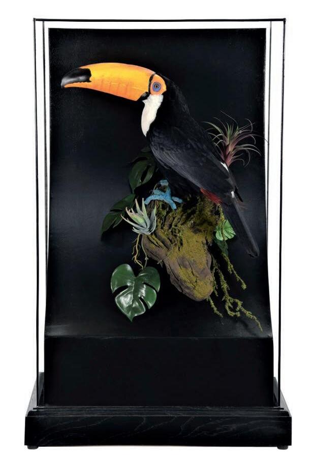Taxidermy: A Monumental Late Victorian Cased Display of Tropical Birds Native to South America & South East Asia & Oceana, circa 1870-1900, a superb quality colourful display of over seventy various specimens, to include - Lesser bird-of-paradise, Toco toucan, Red-legged honeycreeper, Rollers, Snowy egret, Plum-headed parakeet, Noisy pitta, Waxwing, Nightjars, Woodpeckers, Red-cowled cardinals, Brazilian tanager, Campo troupial, Crimson rosella, Amazon kingfisher, Eastern rosella, Spotted pardolate, Chestnut-back antshrike, Saffron finch, numerous Hummingbirds, etc, all mounted upon meandering branches, set above soil, grass, and fauna covered groundwork, against a pale blue painted backdrop, enclosed within a large period mahogany framed floor standing single-glass display case, 166cm by 37cm by 154cm