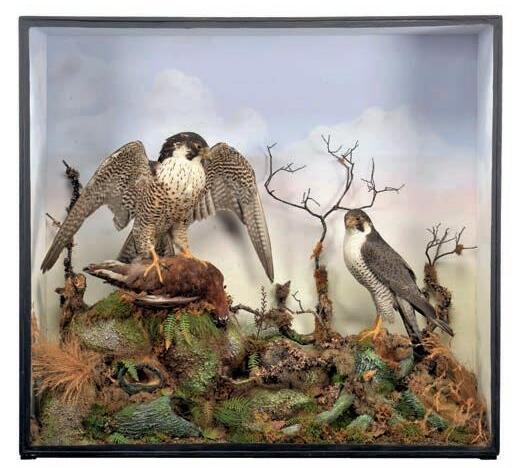 Taxidermy: A Late Victorian Cased Pair of Peregrine Falcons (Falco peregrinus), by Cecil. H. Bisshopp, Taxidermist Artist, 124 George Street, Oban, Scotland, a superb pair of adult full mounts, the female stood upon a Red grouse prey with wings open, the male perched beside her upon a simulated cut tree trunk, both mounted upon painted simulated tree stumps and groundwork, amidst branches, dry grasses and ferns, set against a painted cloudy sky backdrop, enclosed within a typical period ebonised single-glass display case, 101cm by 32cm by 93.5cm, bearing taxidermist’s small paper trade label to interior lower left