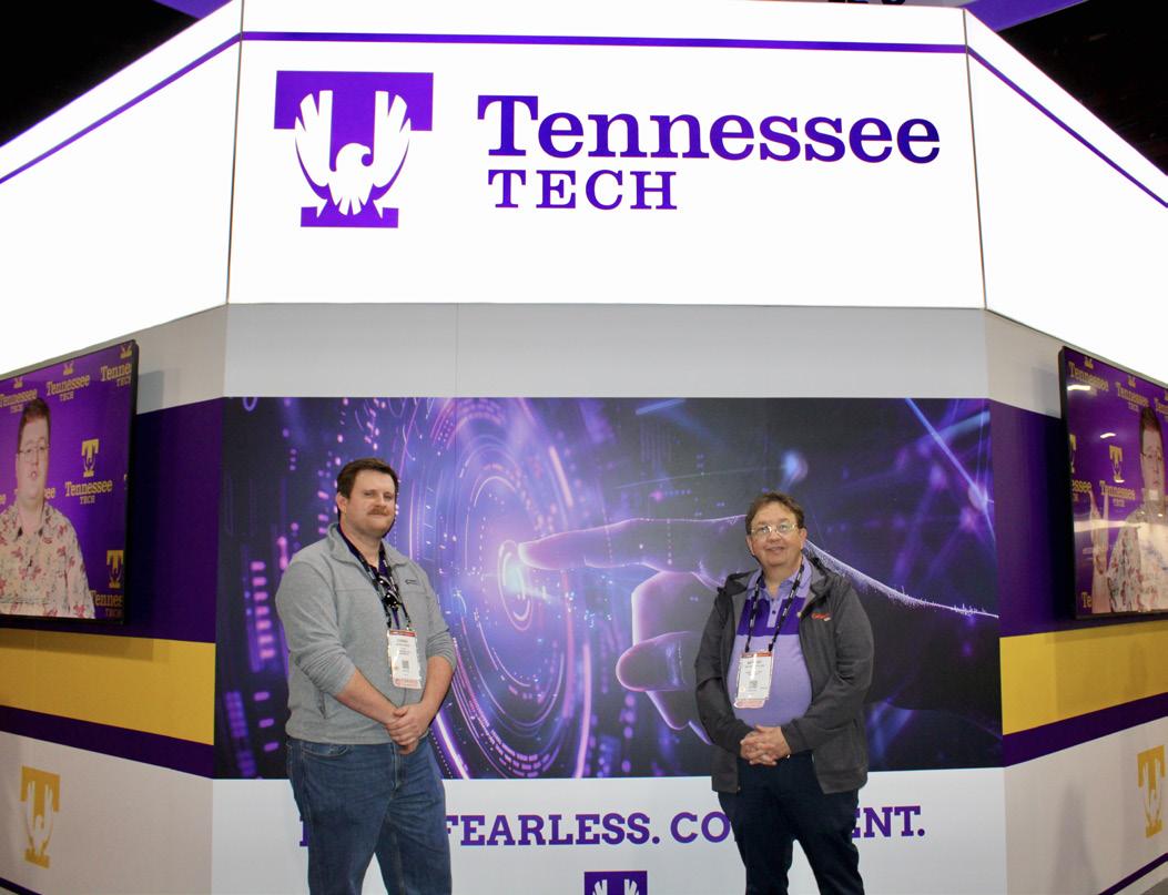 Corbin Cawood, senior scalable systems and networks architect, left, and Tony Skjellum, Ph.D., computer science professor, stand by Tech’s booth at SC24.
