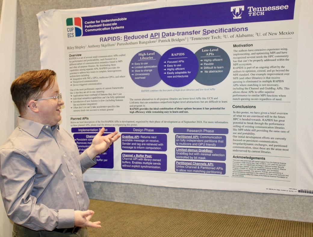 Researcher Riley Shipley presents a poster on Reduced API Data-Transfer Specification. He said,“Engaging with other professionals at SC24 is a good way to get a new perspective on your work because you get to see it in the context of other research in the same area and hear other people’s thoughts.”
