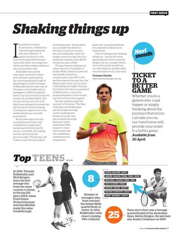 nnovation, in some dictionaries, is defined as “introducing something new and different”. It applies perfectly to the ever-evolving world of tennis – especially lately, as young stars showcase their unique talents in the most positive way. Australian fans can be especially excited by what’s new. Already captivated by the stunning breakthrough of Nick Kyrgios in 2014, Thanasi Kokkinakis has become one of the game’s most talked about teenagers in 2015, boosted by Davis Cup success and his fourth round run at Indian Wells. The 18-year-old (he turns 19 on 10 April) was sitting just outside the top 100 at the time of writing; cracking the upper level in the weeks ahead was virtually guaranteed. At the same time, the stillyoung Bernard Tomic had completed an impressive turnaround with his top 30 return, a world No.29 ranking just two spots from his previous high. The 22-year-old Tomic is now the top-ranked