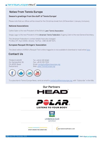 Tel: +41 61 335 9040 Fax: +41 61 331 7253 Email: contactus@tenniseurope.org Web: www.TennisEurope.org