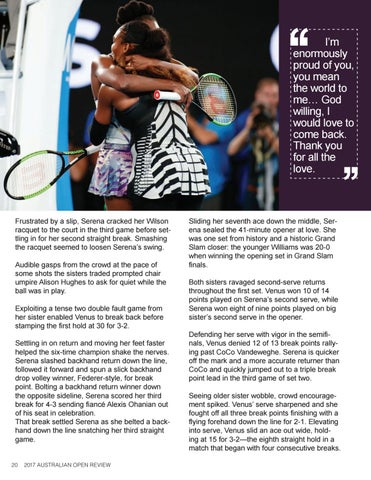 Sliding her seventh ace down the middle, Serena sealed the 41-minute opener at love. She was one set from history and a historic Grand Slam closer: the younger Williams was 20-0 when winning the opening set in Grand Slam finals. Both sisters ravaged second-serve returns throughout the first set. Venus won 10 of 14 points played on Serena’s second serve, while Serena won eight of nine points played on big sister’s second serve in the opener. Defending her serve with vigor in the semifinals, Venus denied 12 of 13 break points rallying past CoCo Vandeweghe. Serena is quicker off the mark and a more accurate returner than CoCo and quickly jumped out to a triple break point lead in the third game of set two. Seeing older sister wobble, crowd encouragement spiked. Venus’ serve sharpened and she fought off all three break points finishing with a flying forehand down the line for 2-1. Elevating into serve, Venus slid an ace out wide, holding at 15 for 3-2—the eighth straight hold in a match that began with four consecutive breaks.