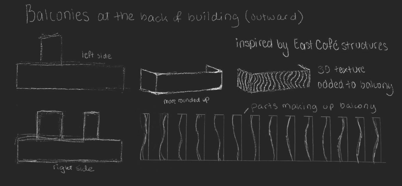 Cutting the original box shape in half and separating it, created the issue of having little space for a hallway and stairs within the building By conducting more research, I got inspired by the idea of having a balcony on the upper floors covering the façade of the sides facing the middle pathway between the two buildings. The long, shared balcony would act as an external hallway, saving space inside of the building and adding more texture/shape to the building Creating this would make it necessary to alter the placement of the stacked wavy details on the façade inspired by the “East Beach Café” However, as I would like to keep them as a texture element, I could place them in between each door or use them to mock a wall to prevent wind Apart from preventing the wind, such structures could also aid in improving privacy of the residents.