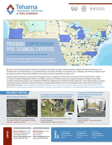 /// Tepa, LLC’s Environment service line includes three tribally owned small businesses: Tehama Technical Services, LLC (Tehama TS) and Tehama ECS, LLC (Tehama ECS), both 8(a)-certified, and Tehama, LLC (Tehama). All three are Indian Small Business Economic Enterprises (ISBEEs) and wholly owned subsidiaries of Tepa, LLC.