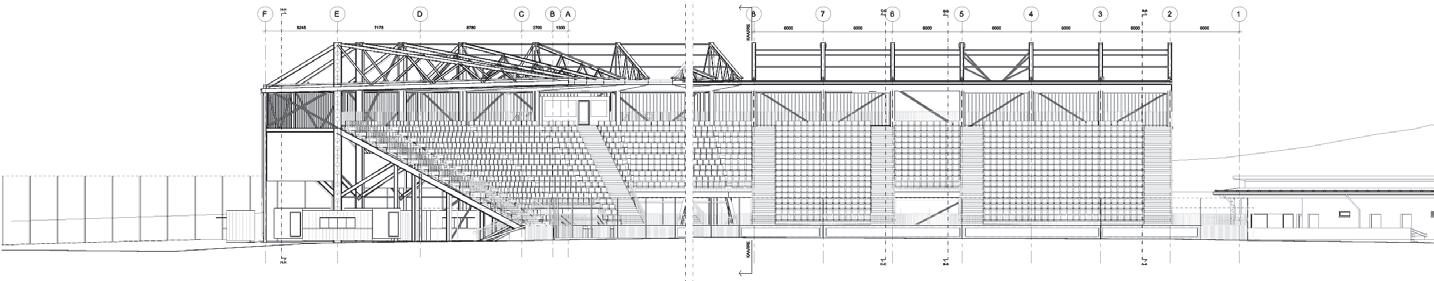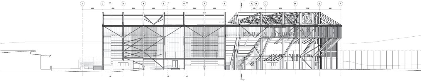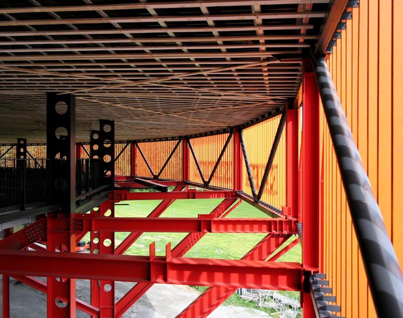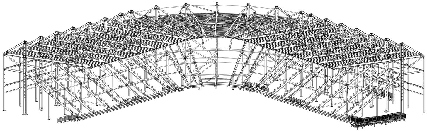 Kolmeen liikuntasaumalohkoon jaetun katsomon teräsrungossa on otettu huomioon seuraamusluokan CC3b vaatimukset onnettomuustilanteen vaurionsietokyvyn parantamiseksi. Tämä toteutettiin lisäämällä poikittaisia sidelinjoja katoksen yläpuolella ja ulkoreunoilla sekä keskeisten liitosten vaurionsietokykyä parantamalla.