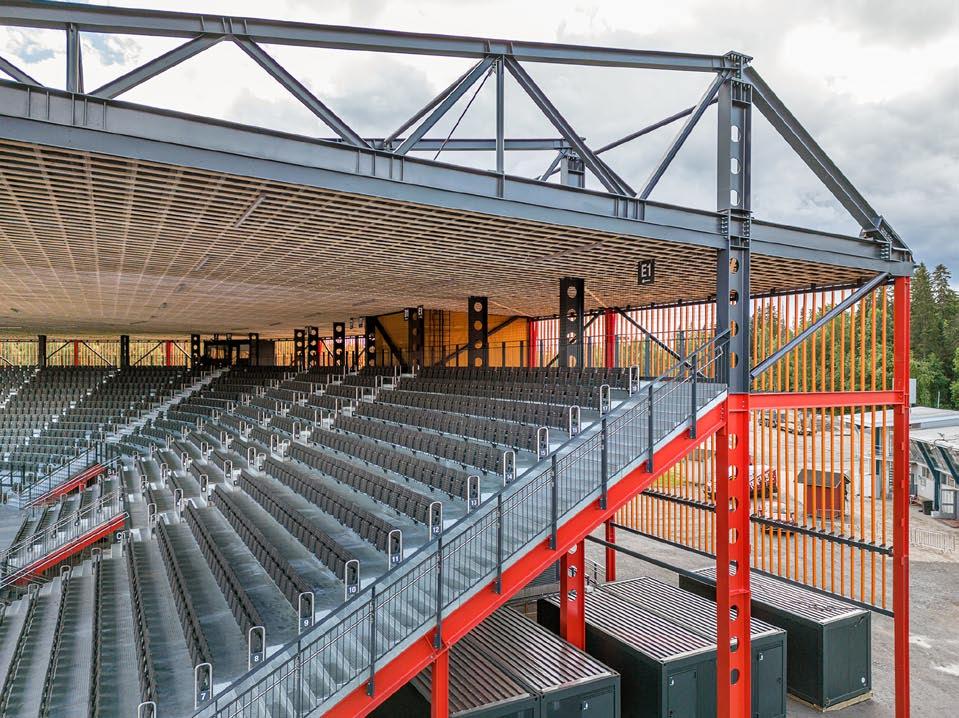 Katsomon istuintasot ja portaat on tehty muotoon taivutetusta kuumasinkitystä kyynellevystä, johon on integroitu istuimien tuki- ja kiinnitysrakenteet. Istuintasot ja portaat tukeutuvat katsomon kehärakenteen teräspalkkeihin. Katsomo- ja katosrakenteiden ulkona olevien teräsrakenteiden osalta teräsrungon palomitoituksessa hyödynnettiin toiminnallista tarkastelua ja näin ollen ne pystyttiin toteuttamaan palosuojaamattomana. Rakennuksen paloluokka on P0/P1.