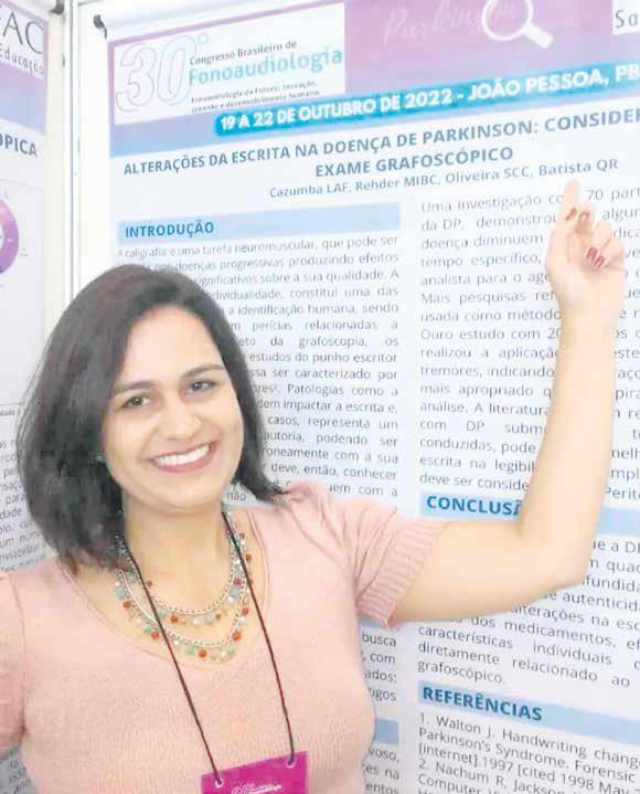 “Recentemente, a profissão conta com a perícia fonoaudiológica como mais uma conquista da área. São possibilidades deste profissional auxiliar a Justiça como o perito nomeado pelo juiz ou como assistente técnico contratado para um parecer técnico. Exemplo disso são processos que tratam de fraudes, assédio e ameaças, por exemplo, nos quais biomarcadores vocais ou assinaturas em documentos servem de base para identificação dos responsáveis. O fonoaudiólogo perito atua em processos trabalhistas na verificação do nexo causal, como exemplo a perda da voz, da audição, fraudes em concursos públicos e diligências para verificação dos critérios para direito ao benefício assistencial LOAS, do INSS, por exemplo”, explica.