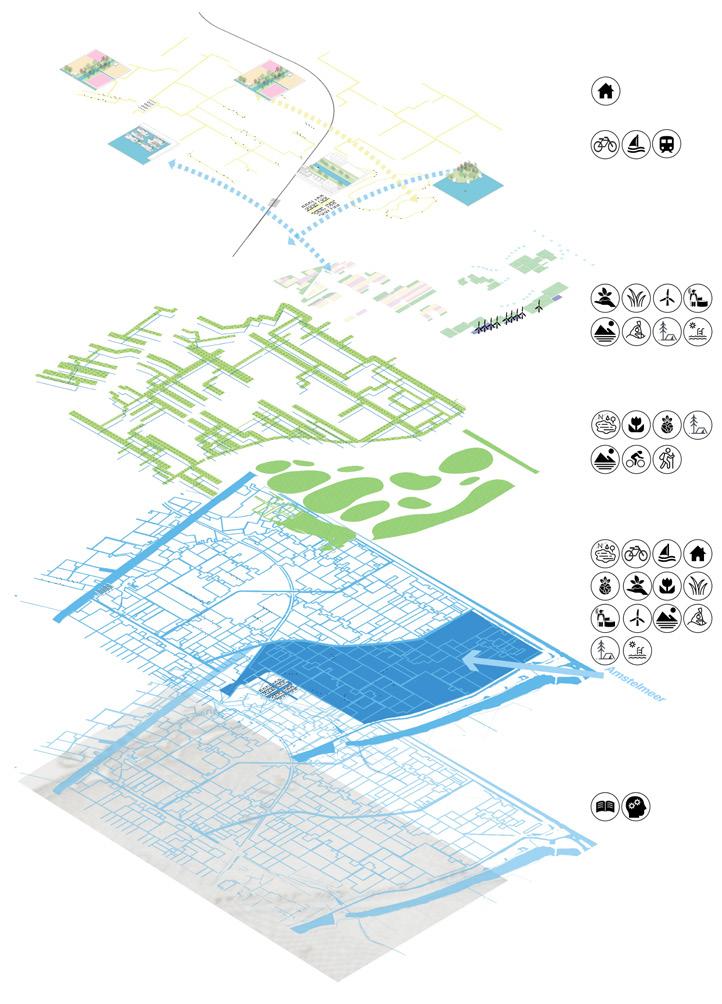 The change in land use and development of nature complete the Nitrogen buffer system. Pier houses are located on the islands. They can be reached by bikes and boats.