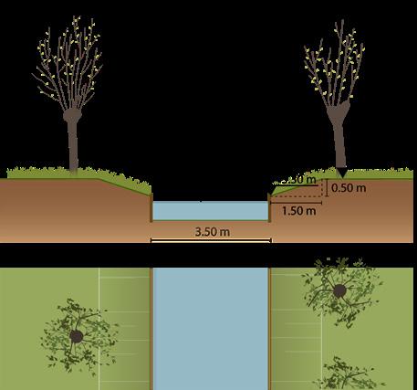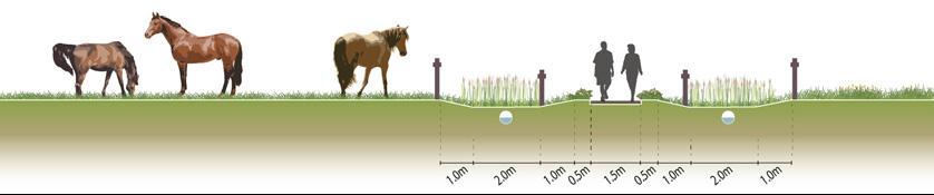 Wetland buffer zones are well-known for removing agricultural water pollutants, such as Nitrogen. A critical area to buffer is the intersection of the pollution loading area and runoff generating area, and the WBZs are often more effective along small/low-level streams. It is also suggested that better removal effects take place where shallow groundwater flows through and is confined within the WBZ plant root zone. Fortunately, the study area has a shallow groundwater level. The WBZ system not only accentuates the polder structure and strengthens the cultural landscape, but also serves as the ecological corridor. On top of that, it provides a beautiful environment for living and tourism. It also allows for the development of a slow mobility system, mainly for cyclists and hikers.