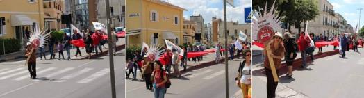 Arrivati nella piazza Vittorio Veneto i partecipanti hanno compiuto un giro nella piazza formando una spirale con il Serpente, il tutto in un'atmosfera gioiosa e coinvolgente. Il Nastro Rosso ha parlato alla gente ed è stato molto più che una macchia di colore.