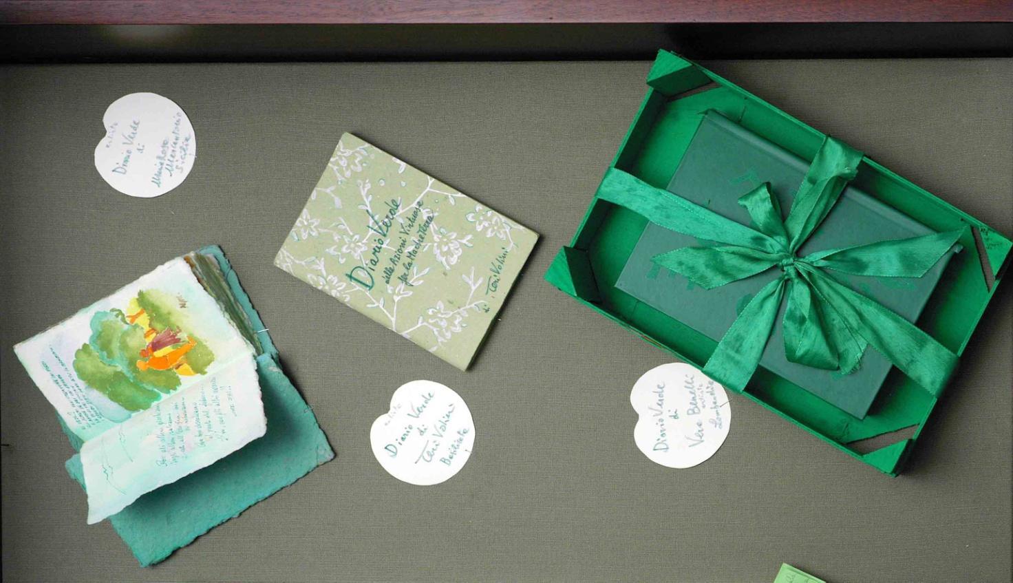 Il Diario Verde delle Azioni Virtuose per la Madre Terra, i piccoli diari realizzati dagli allievi delle quarte classi della scuola elementare S. Maria, installati per l'esposizione.