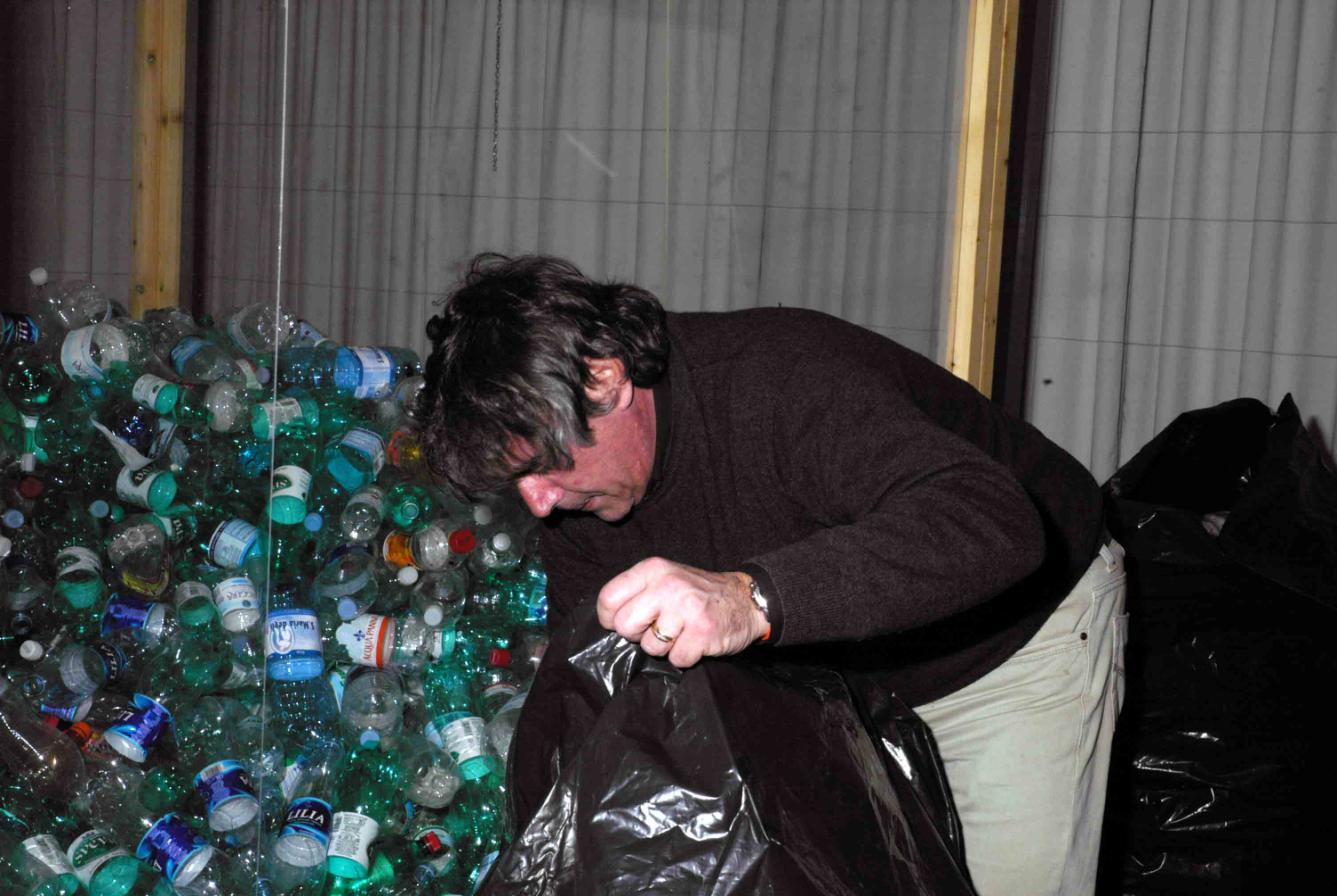 La Stanza Differenziata grande installazione del cubo-stanza in legno e plexiglas completamente saturato di bottiglie in plastica da riciclare.