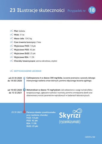 Pierwsza dawka ryzankizumabu przy nasileniu choroby: PASI: 7,8 pkt PSSI: 42 pkt BSA: 11,5% DLQI: 25 pkt