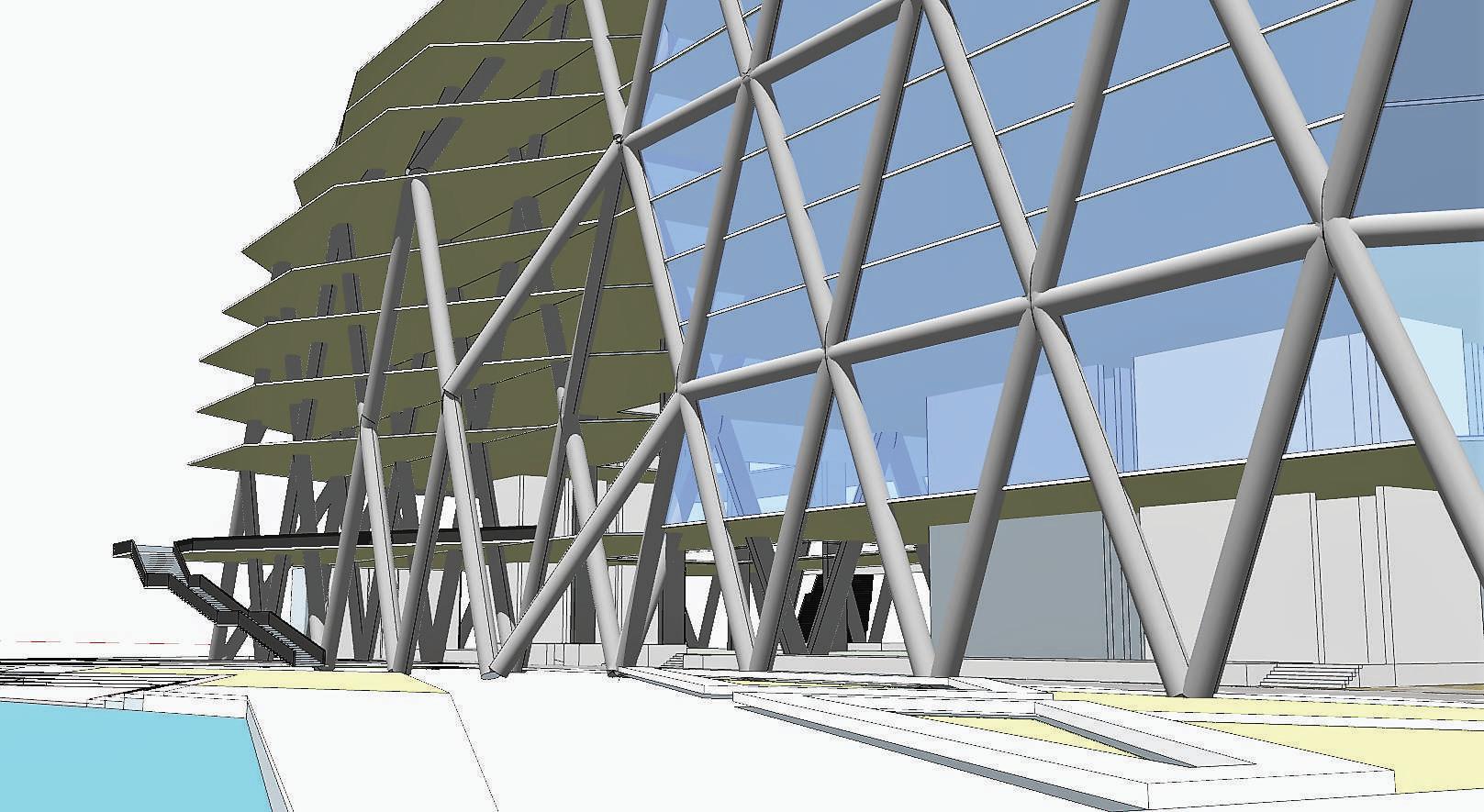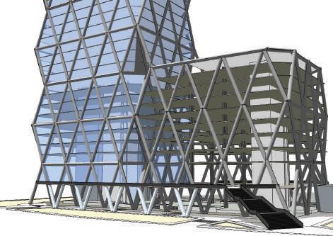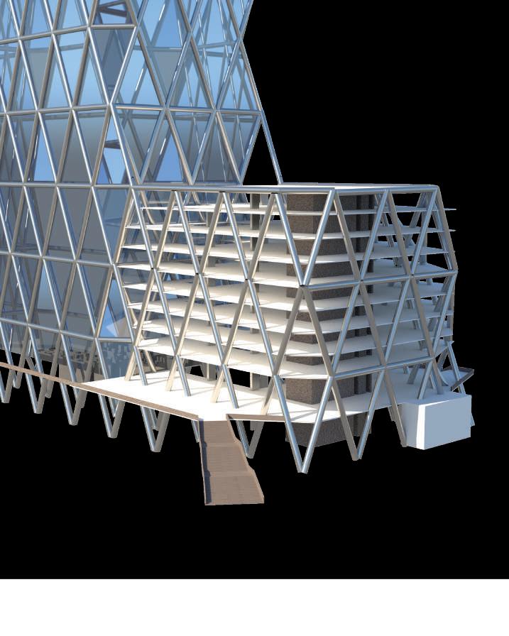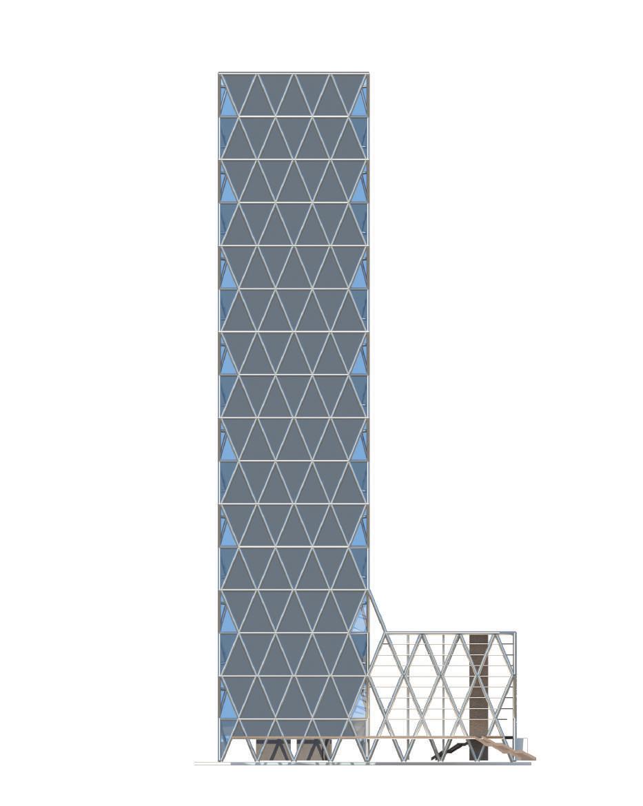 The project comprises of diagrid strcuture for various reasons. Aside from its aesthetic value, a diagrid structure has a number of advantages structurally and environmentally. When compared to a brace frame structure, diagrid can save up to 20% of the steel. When glass panels are integrated with a diagrid, a tremendous amount of light enters the interior spaces. It also eliminates the requirement for columns on the interior and exterior spaces, allowing for more innovative floor layouts.
