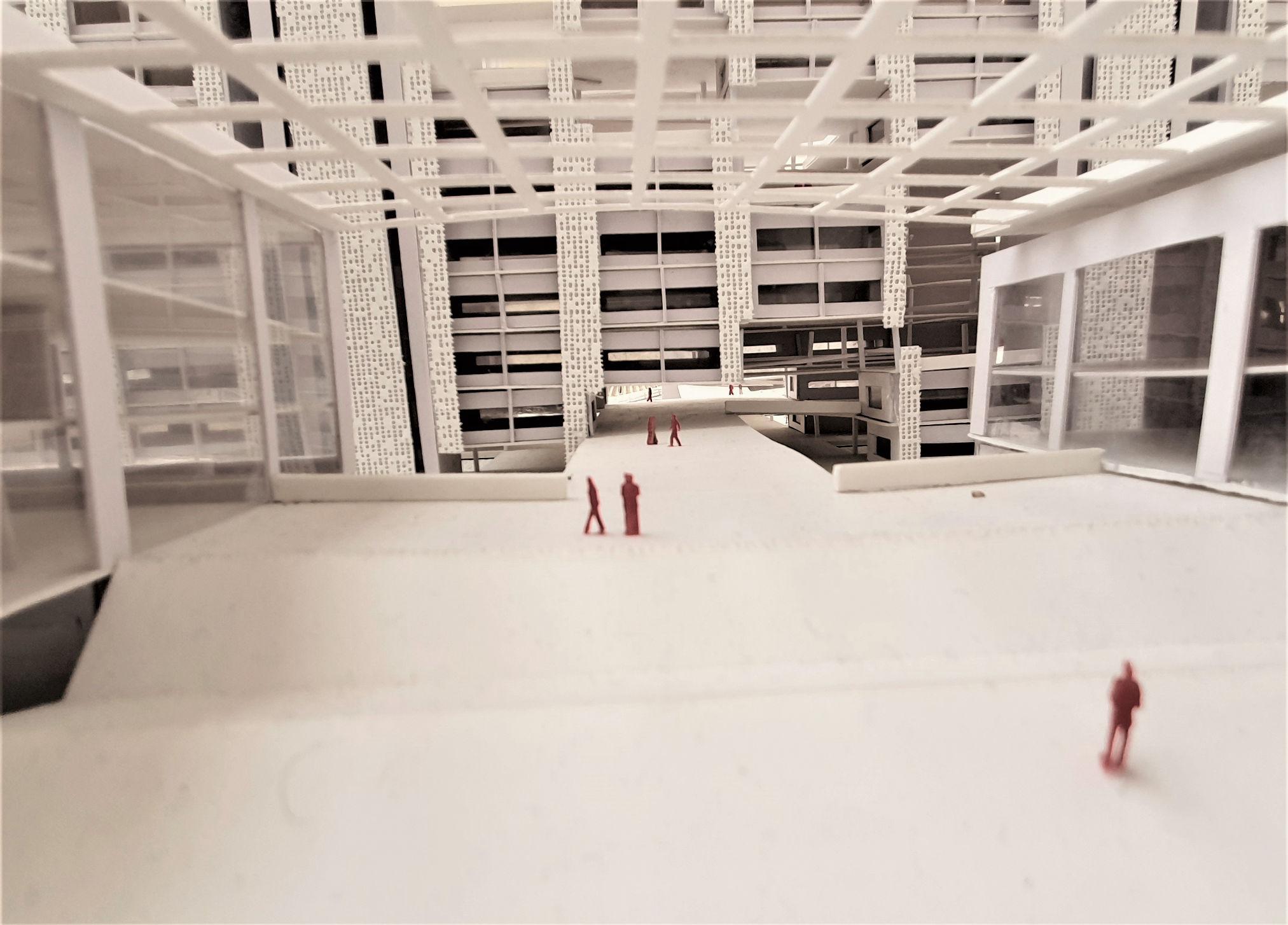 The design is developed in such a way that the housing zone is agglomerated in the enterprise zone. A shared street has been proposed that connects all the buildings and communcal amenities. The project is entirely focused on pedestrian and cyclist movements with street vending activities at various places in order to elevate its communal and public value.