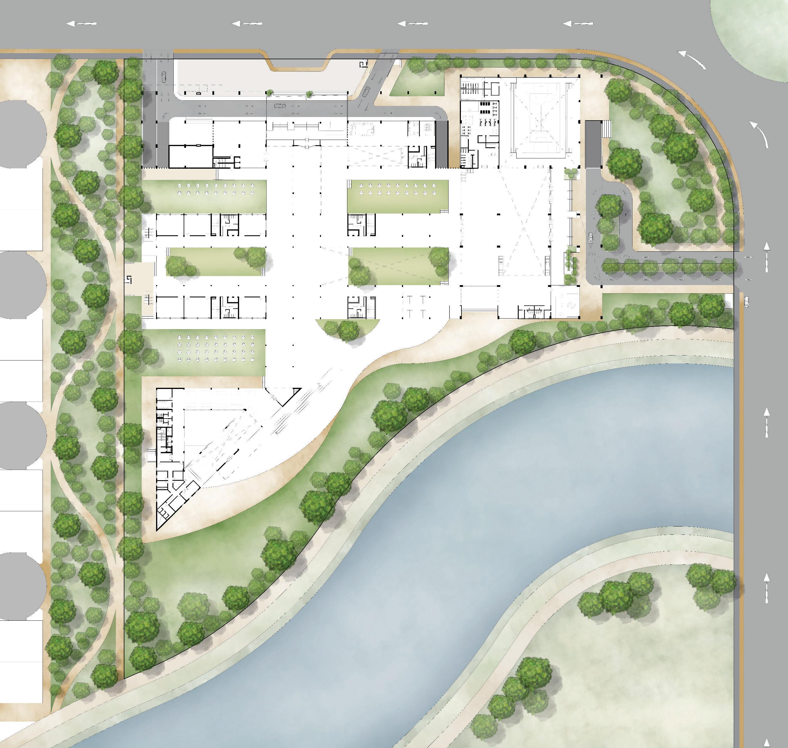 Due to the densely packed surroundings, enhancing the urban life of the neighboring areas was the project's primary purpose. The ground floor has remained open to the public, enabling free pedestrian mobility. The landscape has been extended from the park behind the site and brought into the site, with a water body in between visually connecting the two sites while also acting as a barrier.