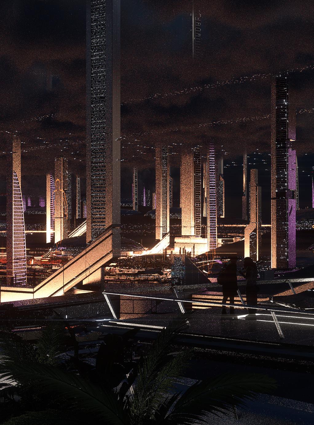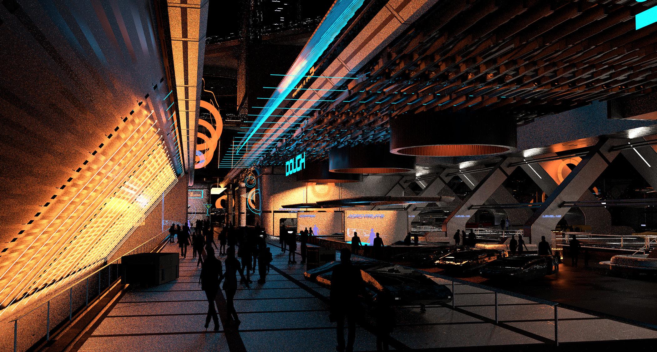 [ 5.44 ] Site 03 Scene 0002 - A pedestrian area on level 42 aboard one of the sky habitats over Panama City. A brief opening in the roof gives a hint at the scale of the vertical city beyond + Scene of Space 0001This scene provides an indication of our presence in space. Below we can see the space elevators extending up from Panama City, along with the glow of the megastructures and future coastal cities that cover the planet.