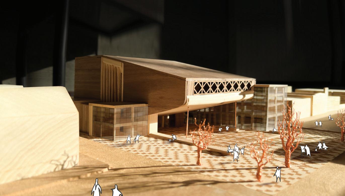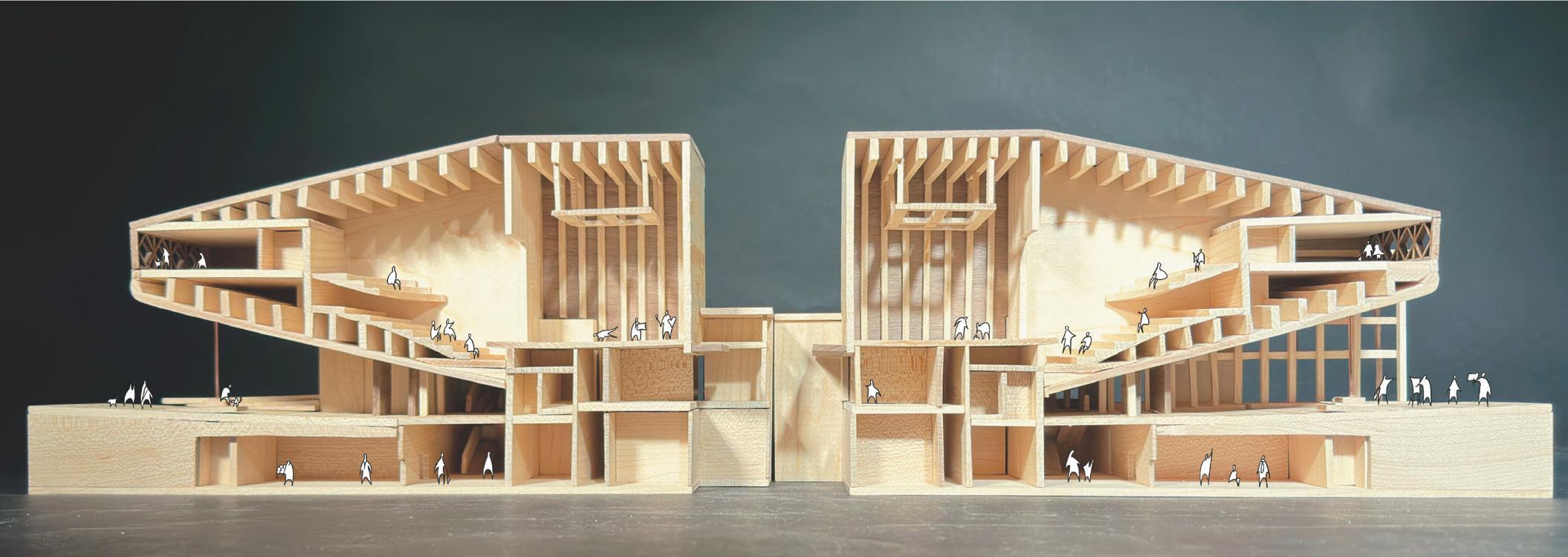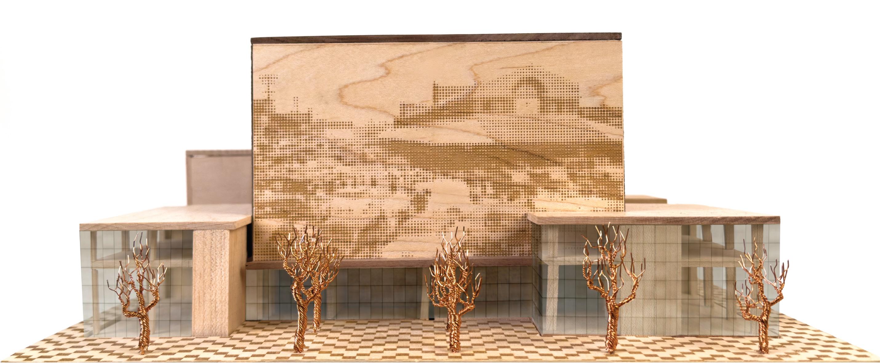 The Byward Market Playhouse proposes the replacement of a City of Ottawa-owned parking structure situated at 70 Clarence Street into a destination building. The theatre is surrounded by community ateliers, shops, and restaurants. With careful consideration of the surrounding streetscape, the proposition carves alleys through and around an oval theatre, to organize interior circulation and uses, and to weave the new building into the existing neighbourhood. The theatre’s protruding fabric-formed concrete mass acts as a central structural element while containing a moss garden within its folds. This soft landscape helps to attenuate sound in the courtyard. The façade details combine brick, perforated Corten steel panels, and garage doors to allow users to manipulate the levels of light entering the building while organizing a fluid relationship of the interior and exterior. The 1:200 model uses oxidized copper and lacewood to evoke the tones and patina of the Byward Market's historic and weathered fabric.