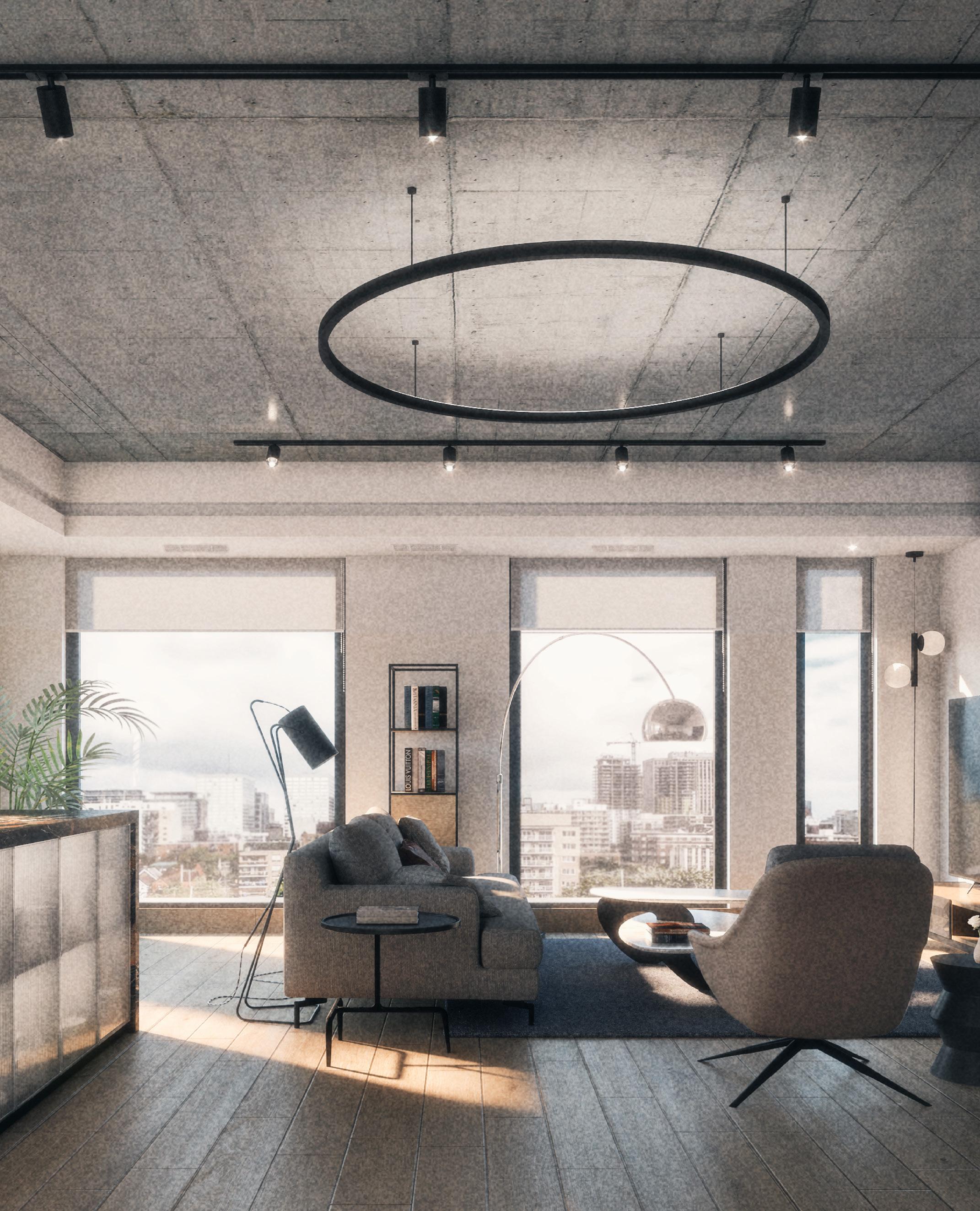 Brick Commons proposes a new housing community that accommodates a wide range of age groups and abilities. The project consists of two mid-rise buildings: the mixeduse “Building A” on Montreal Road and another along Lévis Avenue. The project is part of a larger call for urbanization and repurposing of the Vanier neigbourhood into a vibrant and inclusive place for artists. “Building A” features commercial spaces and film and music studios. The predominance of brick in the buildings along Montreal Road inspired the material palette.